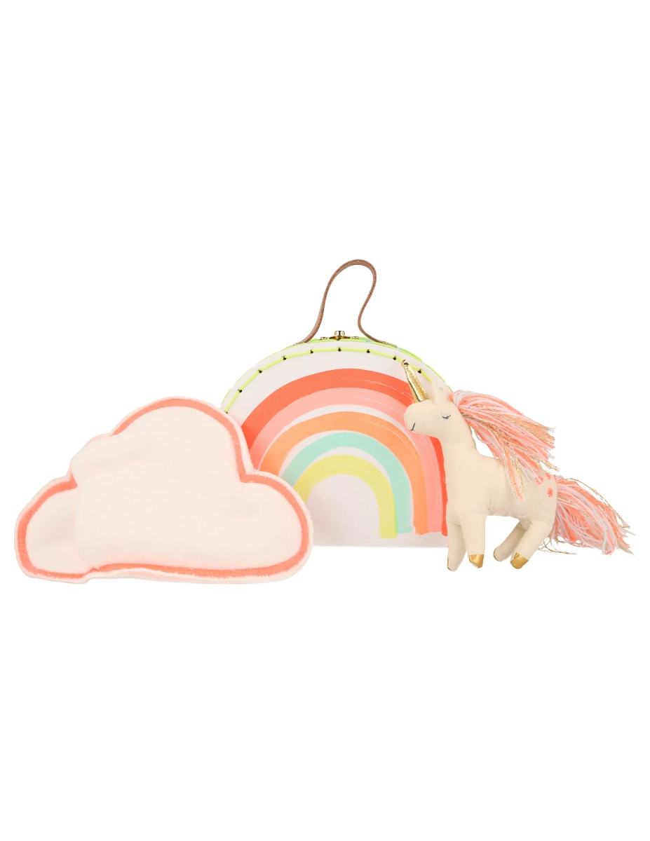 Little ones will love this truly magical gift! Inside the beautiful rainbow suitcase is an adorable mini unicorn, expertly crafted from soft cotton with sweet embroidered features, felt ears, a shiny gold horn and a colorful yarn mane and tail. The set also features a sensational cloud sleeping bag, for the unicorn to snuggle up into for amazing dreams.