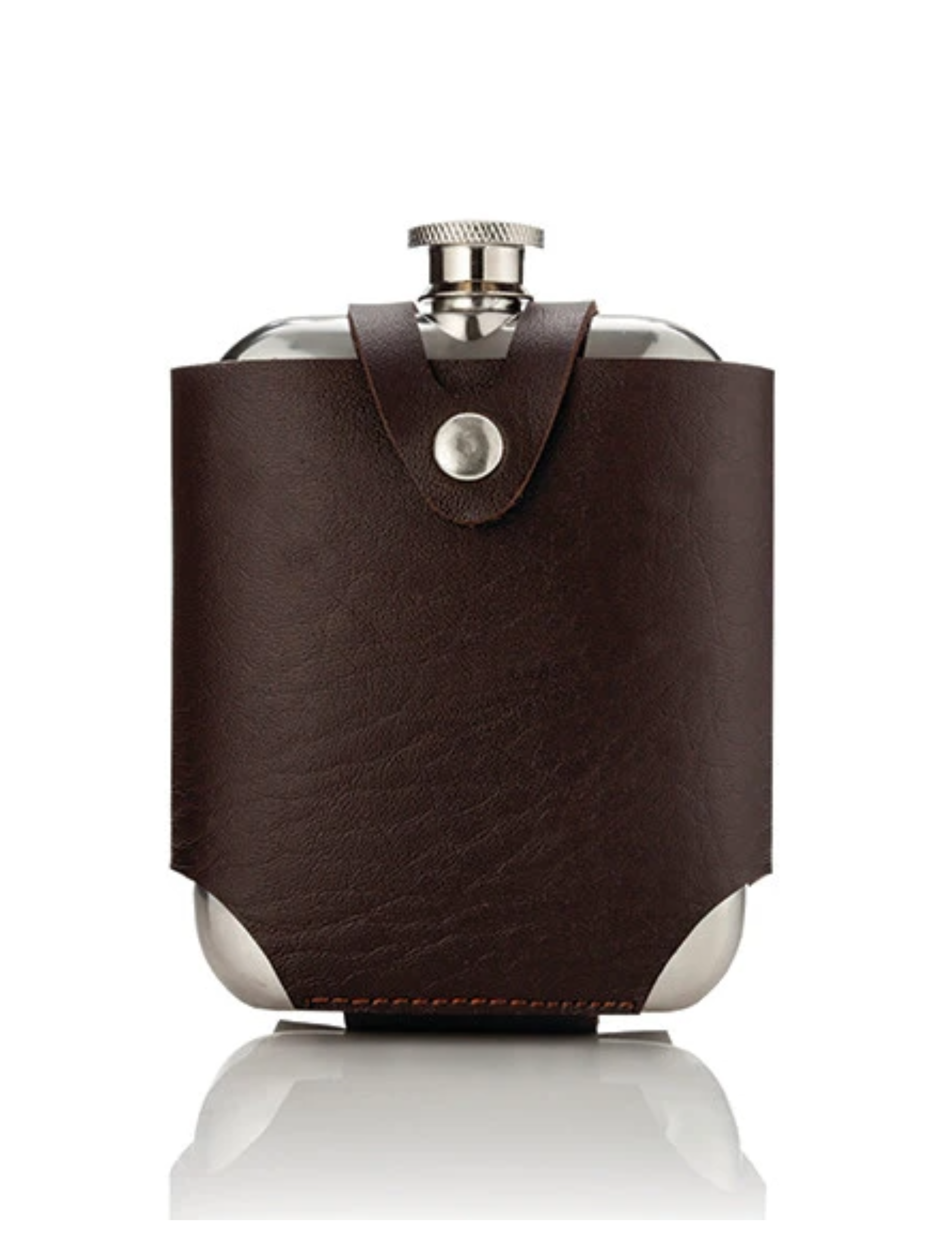 Flasks were made for voyagers. Snap your silver five-ounce vessel into a rich chocolate-brown carrying case and set off on the next adventure.