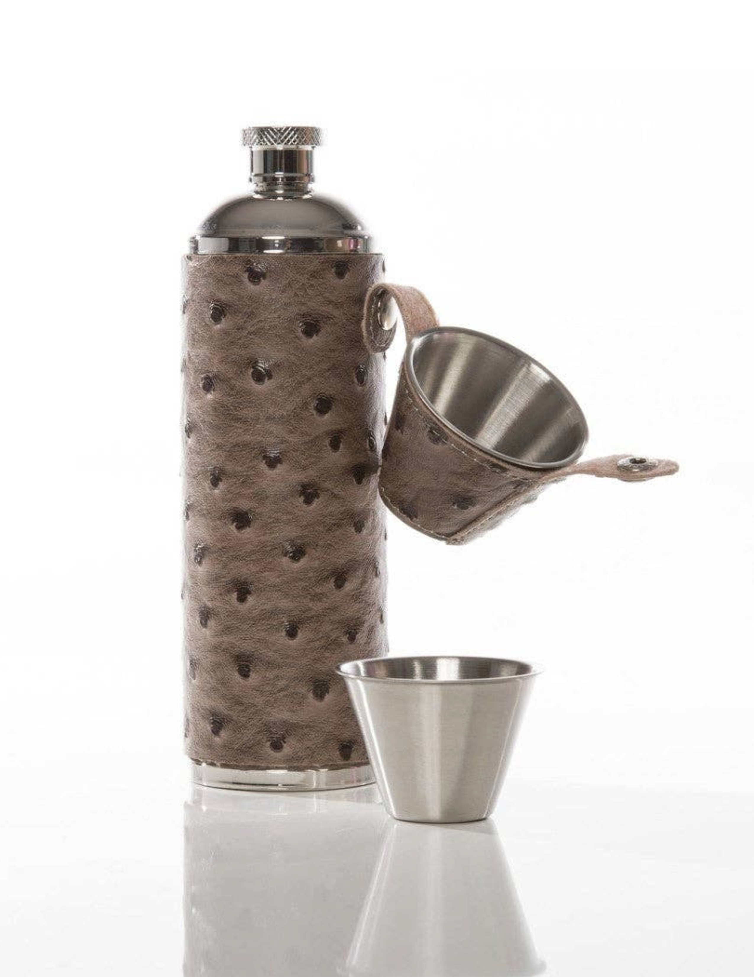 The hunters flask holds two shot cups which act as a lid. The leather encases the stainless steel flask and cups with a button seal for easy access. 10 oz.