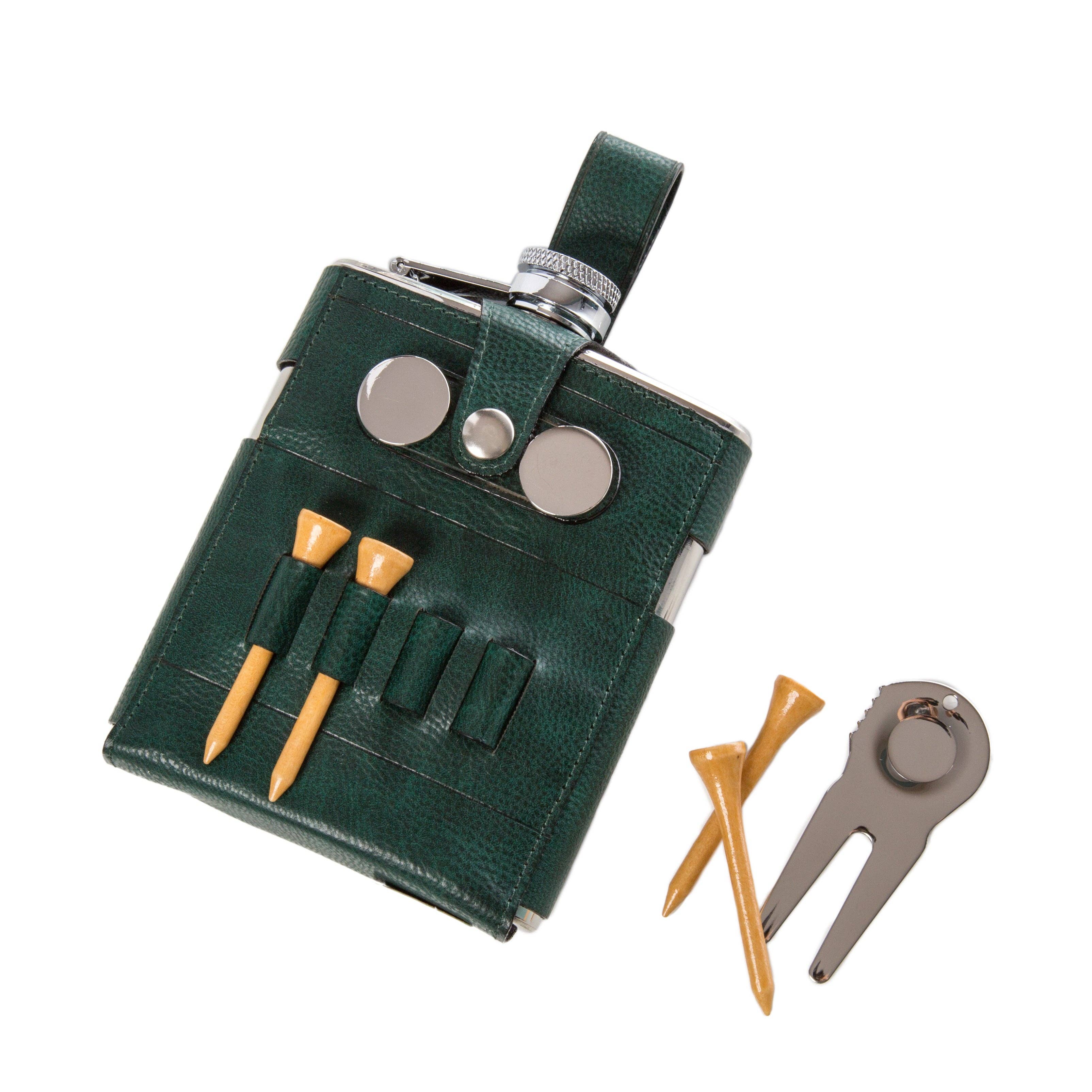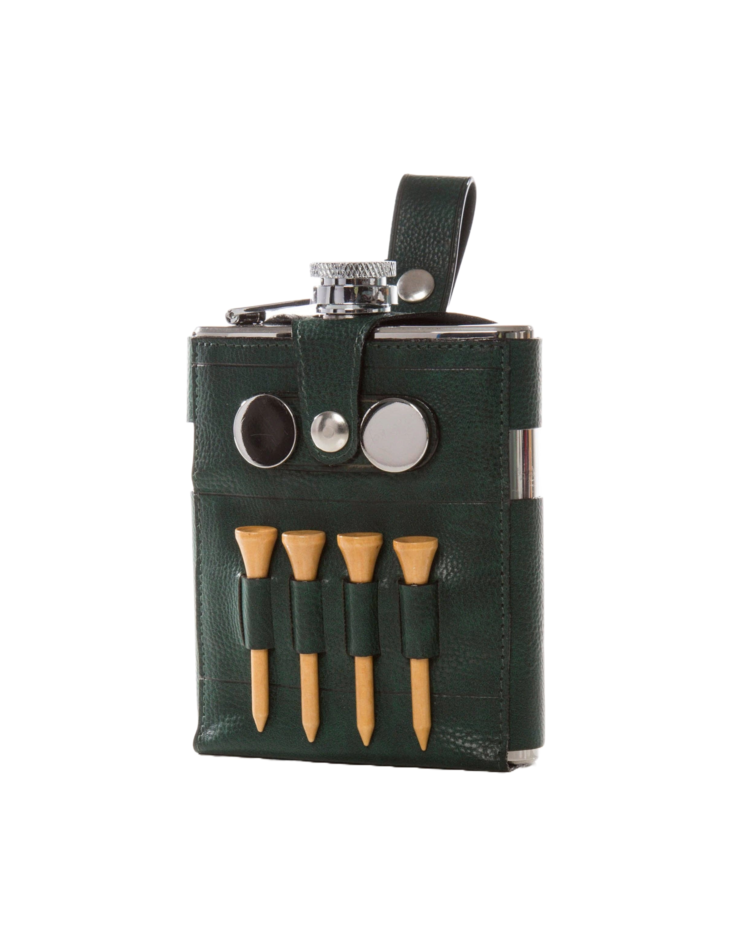Get ready to tee up with this leather wrapped hip flask. For the indulgent golfer, this stainless steel flask features a belt loop for hands free action, tees, markers, and pitch: everything you need for the perfect afternoon on the course.