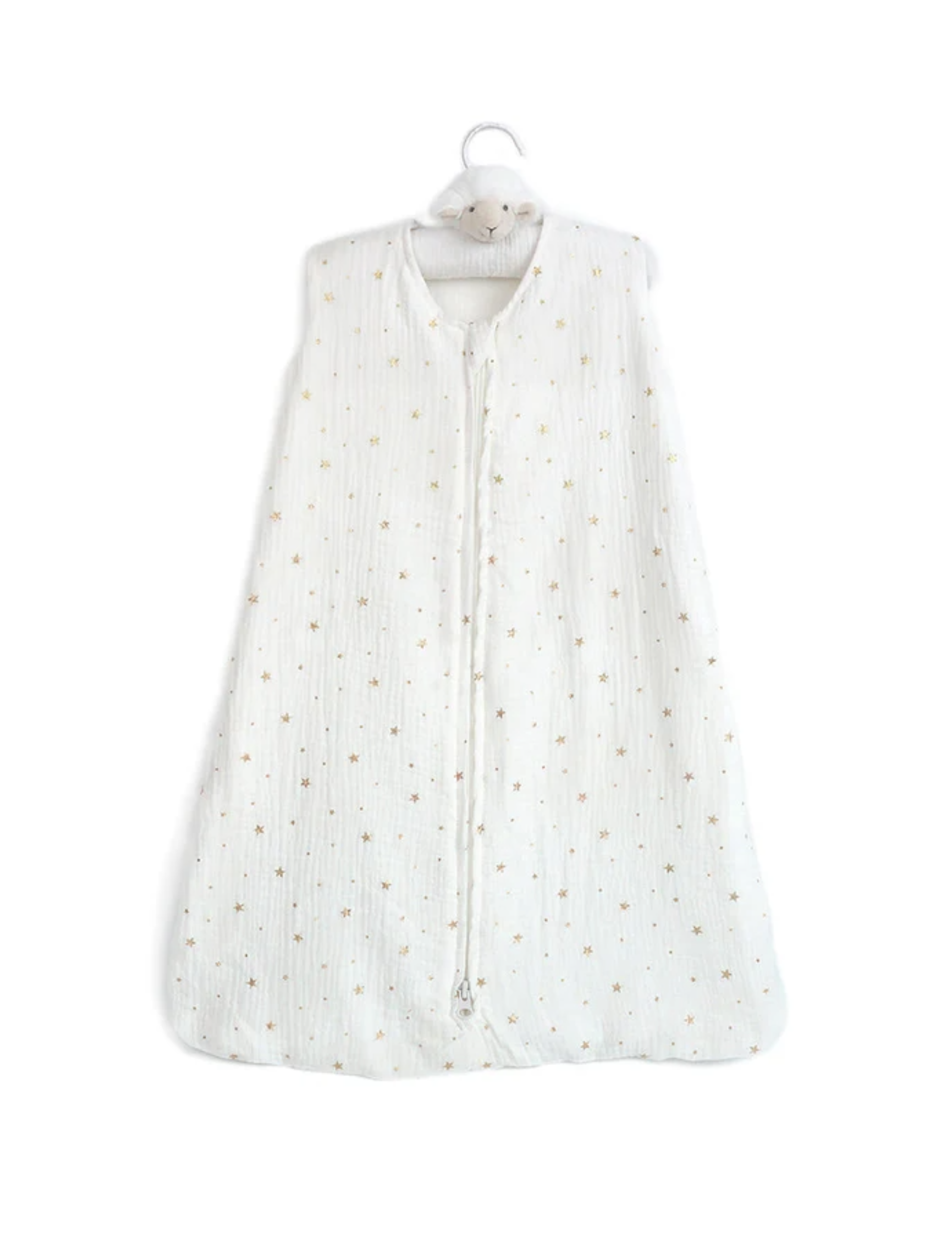 Celestial Lamb Sleep Sack is double lined premium muslin sleep sack adorned with golden star pattern. Made of breathable and soothing cotton and comes on a whimsical padded lamb hanger to create a beautiful gift!