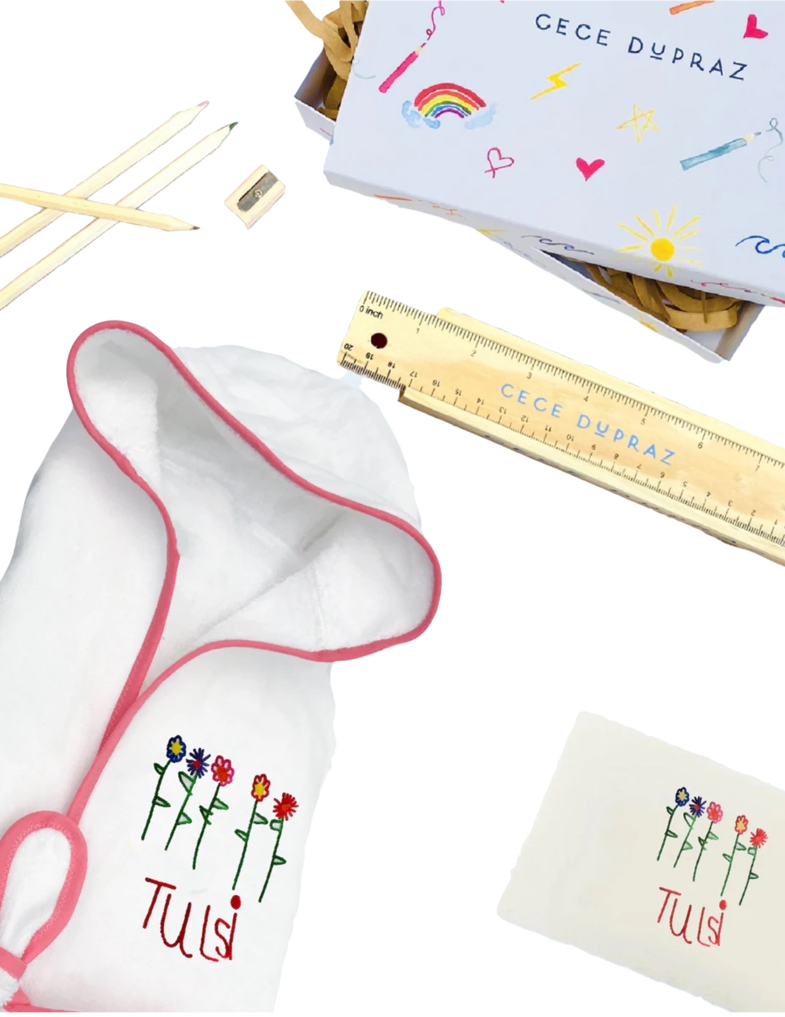 Cece's Design Your Own Kid Robe gift set contains all the components the recipient will need to create a doodle masterpiece which we will turn into the embroidery for a kid robe.