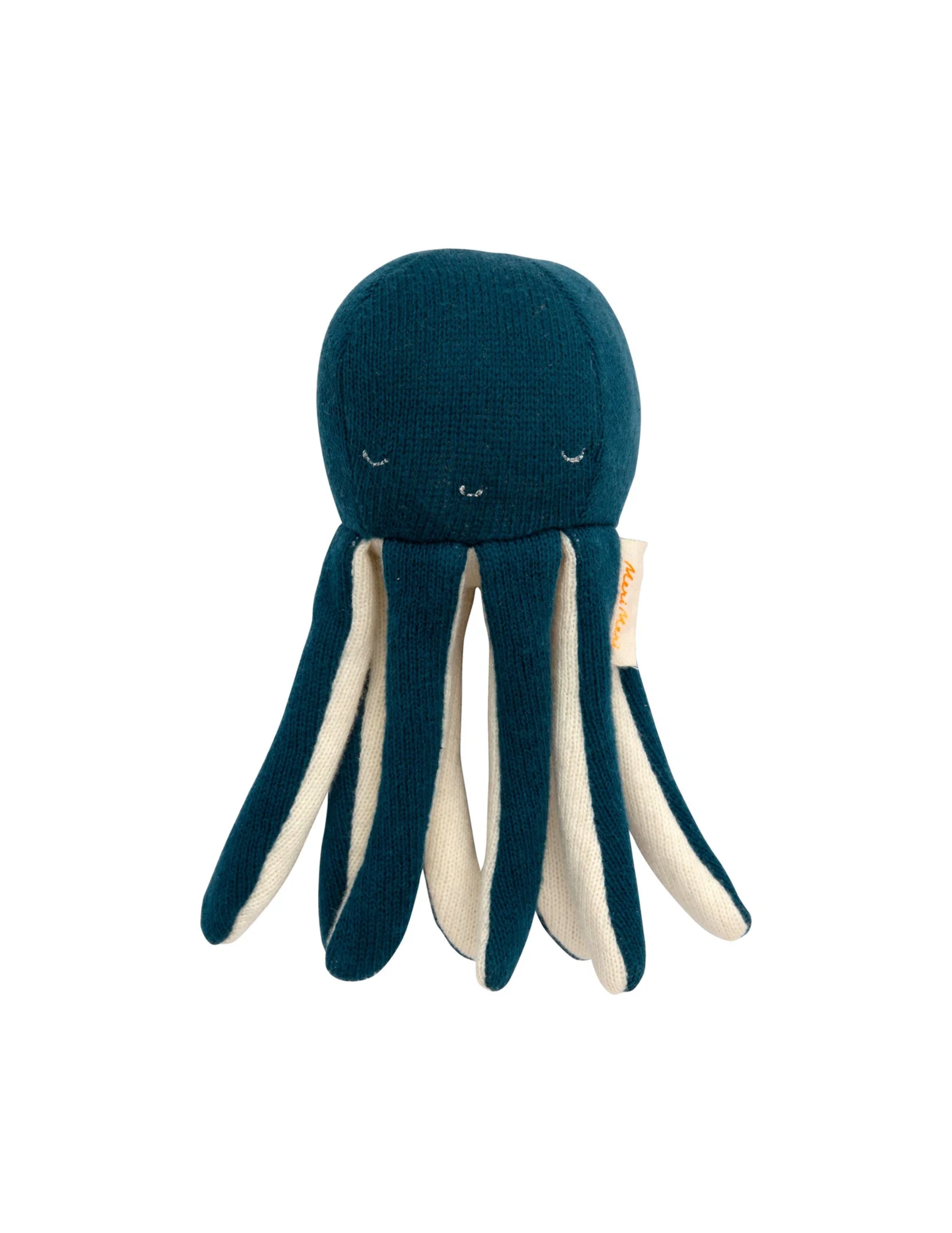 This adorable octopus rattle, made from soft organic knitted cotton, will delight little ones with its sweet embroidered face and dangling arms.